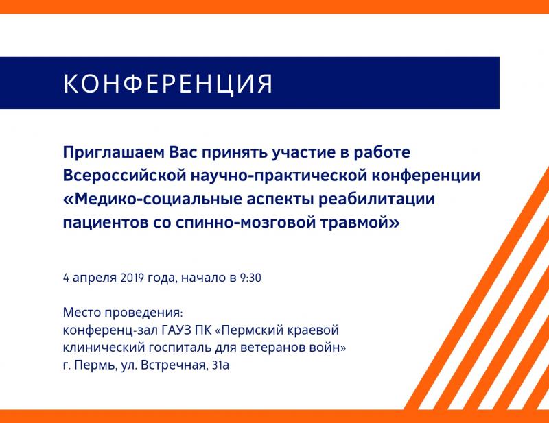 Современные технологии для "спинальников"29 марта 2019, пт Пациентов со спинно-мозговой травмой приглашают принять участие в работе Всероссийской научно-практической конференции «Медико-социальные аспекты реабилитации» 4 апреля. Дата проведения: 4 апреля 2019 г. с 9:30 до 16:00 в конференц-зале ГАУЗ ПК «Пермский краевой клинический госпиталь для ветеранов войн» (г. Пермь, ул. Встречная, 31а). В рамках конференции будут обсуждаться вопросы медико-социальной реабилитации пациентов со спинно-мозговой травмой, представлены современные технологии робототехники для реабилитации данной категории пациентов, рассмотрены вопросы их социализации и интеграции.