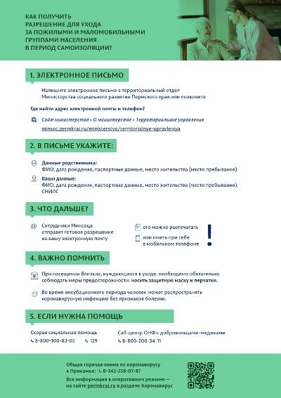 Как оформить разрешение на посещение маломобильного родственника?06 апреля 2020, пн Для заявки нужно направить личное письмо-запрос или позвонить в теруправление Министерства социального развития Пермского края. Адреса и телефоны указаны здесь Для оформления разрешения потребуется указать ФИО, паспортные данные пожилого или маломобильного, или с инвалидностью родственника и место его прописки (пребывания), а также ваши данные и дополнительно ваш СНИЛС. Данные проверят, затем разрешение вышлют на электронную почту. Предъявлять документ можно не только в бумажном, но и электронном виде с экрана мобильного телефона. Если человеку нужна социальная помощь, можно звонить: 129; 8-800-100-83-05. Общая «горячая линия» по коронавирусу 8-342-258-07-87. Поскольку скорость Интернет-соединения заметно упала, для удобства даем контакты теруправлений Минсоцразвития Межрайонное территориальное управление № 1 Телефон: (34 279) 3-29-44 Электронная почта: oh-soc@mail.ru Отдел по Оханскому городскому округу Телефоны: (34 279) 3-14-42, (34 279) 3-29-44, (34 279) 3-03-51 Электронная почта: oh-soc@mail.ru Отдел по Очерскому городскому округу Телефоны: (34 278) 3-15-64, (34 278) 3-08-10, (34 278) 3-55-82 Электронная почта: ocher100@yandex.ru Отдел по Большесосновскому муниципальному району Телефоны: (34 257) 2-76-89, (34 257) 2-74-92, (34 257) 2-70-65 Электронная почта: tumsr-bs@yandex.ru Отдел по Частинскому муниципальному району Телефоны: (34 268) 2-23-33, (34 268) 2-14-41, (34 268) 2-13-17 Электронная почта: tuchastye@yandex.ru Межрайонное территориальное управление № 2 Телефон: (34 254) 3-47-65 Электронная почта: socraz-ver@mail.ru Отдел по Верещагинскому городскому округу Телефоны: (34 254) 3-65-34, (34 254) 3-84-03, (34 254) 3-46-01 Электронная почта: mtu2-ver@mail.ru Отдел по Карагайскому муниципальному району Телефоны: (34 297) 3-26-27, (34 297) 3-11-91, (34 297) 3-16-05 Электронная почта: sockar@mail.ru Отдел по Ильинскому городскому округу Телефоны: (34 276) 9-13-39, (34 276) 9-16-70, (34 276) 9-14-05 Электронная почта: ils_tu@perm.ru Отдел по Сивинскому муниципальному району Телефоны: (34 277) 2-13-44, (34 277) 2-92-01, (34 277) 2-91-51 Электронная почта: socr-siva@mail.ru Межрайонное территориальное управление № 3 Телефон: (34 252) 9-71-05, (34 252) 9-71-01 Электронная почта: tumsrk-kish@mail.ru Отдел по Ординскому муниципальному округу Телефоны: (34 258) 2-02-52, (34 258) 2-64-15 Электронная почта: tudsro-orda@mail.ru Отдел по Березовскому муниципальному округу Телефоны: (34 251) 3-16-41, (34 251) 3-12-88 Электронная почта: bertumsr@inbox.ru Отдел по Суксунскому городскому округу Телефоны: (34 275) 3-14-97, (34 275) 3-13-17 Электронная почта: tu_suksun@mail.ru Отдел по Кишертскому муниципальному округу Телефоны: (34 252) 9-71-02, (34 252) 9-71-06 Электронная почта: tumsrk-kish@mail.ru Межрайонное территориальное управление № 4 Телефон: (34 261) 4-20-09 Электронная почта: dsr-chern@mail.ru Отдел по Чернушинскому городскому округу Телефоны: (34 261) 4-96-61, (34 261) 4-71-00 Электронная почта: oszn-chern@mail.ru Отдел по Октябрьскому городскому округу Телефоны: (34 266) 2-29-47, (34 266) 2-30-02 Электронная почта: tymcp-okt@mail.ru Отдел по Уинскому муниципальному округу Телефон: (34 259) 2-44-95 Электронная почта: otdel.uinskiyrayon@mail.ru Отдел по Куединскому муниципальному району Телефоны: (34 262) 3-44-33, (34 262) 3-23-09 Электронная почта: socz_kueda@bk.ru Межрайонное территориальное управление № 5 Телефон: (34 291) 4-31-09, 8 908 244 23 64 Электронная почта: tumsrk-osa@mail.ru Отдел по Осинскому городскому округу Телефоны: (34 291) 4-31-16, (34 291) 4-30-97 Электронная почта: osa-mtu5@mail.ru Отдел по Бардымскому муниципальному округу Телефоны: (34 292) 2-05-28, (34 292) 2-01-06 Электронная почта: tudcro@mail.ru Отдел по Еловскому муниципальному округу Телефоны: (34 296) 3-19-69, (34 296) 3-10-91 Элек